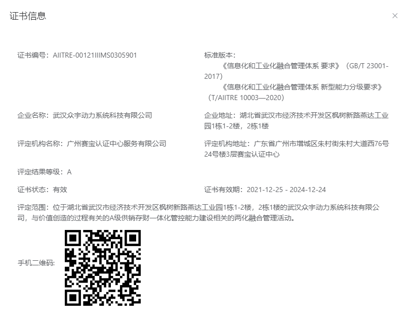 12月25日,武漢眾宇動力系統(tǒng)科技有限公司(下稱眾宇)順利通過《信息化和工業(yè)化融合管理體系要求》(GB/T23001-2017)體系認(rèn)證,被授予兩化融合管理體系評定證書,這標(biāo)志著眾宇在推進(jìn)信息化和工業(yè)化深度融合方面進(jìn)入了新階段,繼知識產(chǎn)權(quán)管理、環(huán)境管理等體系獲認(rèn)證后,公司實力再獲國家級認(rèn)可。