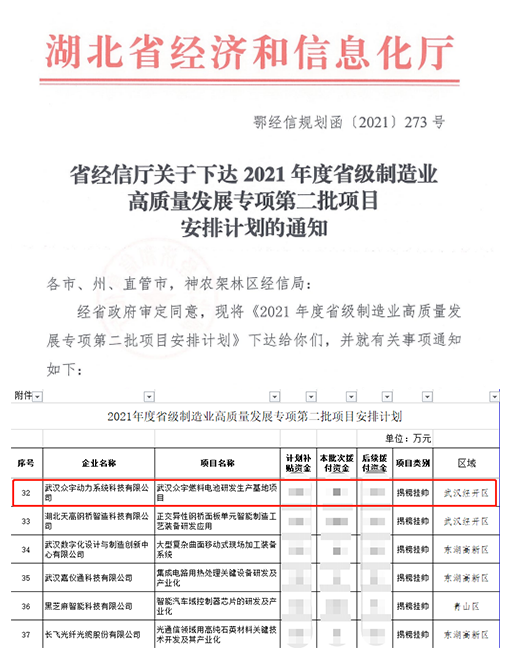 近日,湖北省經(jīng)濟(jì)和信息化廳《省級制造業(yè)高質(zhì)量發(fā)展專項第二批項目》公布,武漢眾宇燃料電池研發(fā)生產(chǎn)基地項目位列其中。
