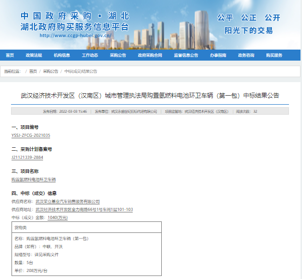 3月3日,武漢經(jīng)濟(jì)技術(shù)開發(fā)區(qū)(漢南區(qū))(下簡稱武漢經(jīng)開區(qū))發(fā)布?xì)淙剂想姵丨h(huán)衛(wèi)車項目中標(biāo)公告,武漢眾宇動力系統(tǒng)科技有限公司(下稱眾宇)將為該項目中標(biāo)車型提供氫燃料電池系統(tǒng)。