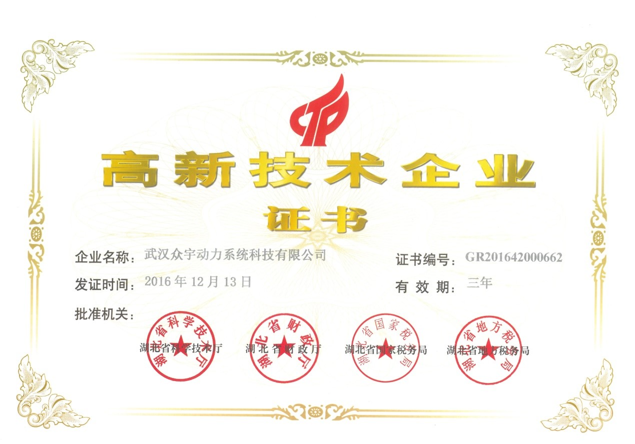 2月24日,武漢眾宇動(dòng)力系統(tǒng)科技有限公司榮獲由湖北省科學(xué)技術(shù)廳、湖北省財(cái)政廳、湖北省國(guó)家稅務(wù)局及湖北省地方稅務(wù)局聯(lián)合頒發(fā)的“高新技術(shù)企業(yè)”認(rèn)定證書,證書的頒發(fā)標(biāo)志著眾宇動(dòng)力的技術(shù)研發(fā)水平得到了進(jìn)一步提升。