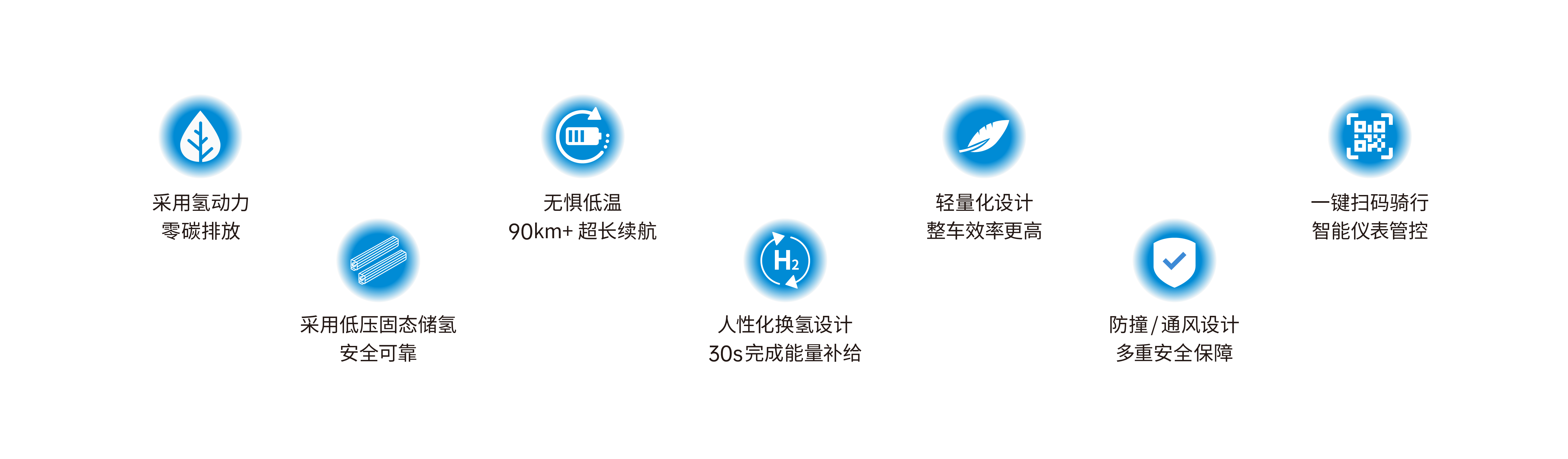 眾宇氫能兩輪車,基于眾宇氫燃料電池系統(tǒng)自主開(kāi)發(fā),配置低壓固態(tài)儲(chǔ)氫系統(tǒng),采用輕量化電堆和智能化電控系統(tǒng)、人性化換氫設(shè)計(jì),具有零碳環(huán)保、安全、長(zhǎng)續(xù)航、管理簡(jiǎn)便等特點(diǎn),適用于短距出行,景區(qū)/高校內(nèi)通勤,共享/快遞配送等場(chǎng)景。
