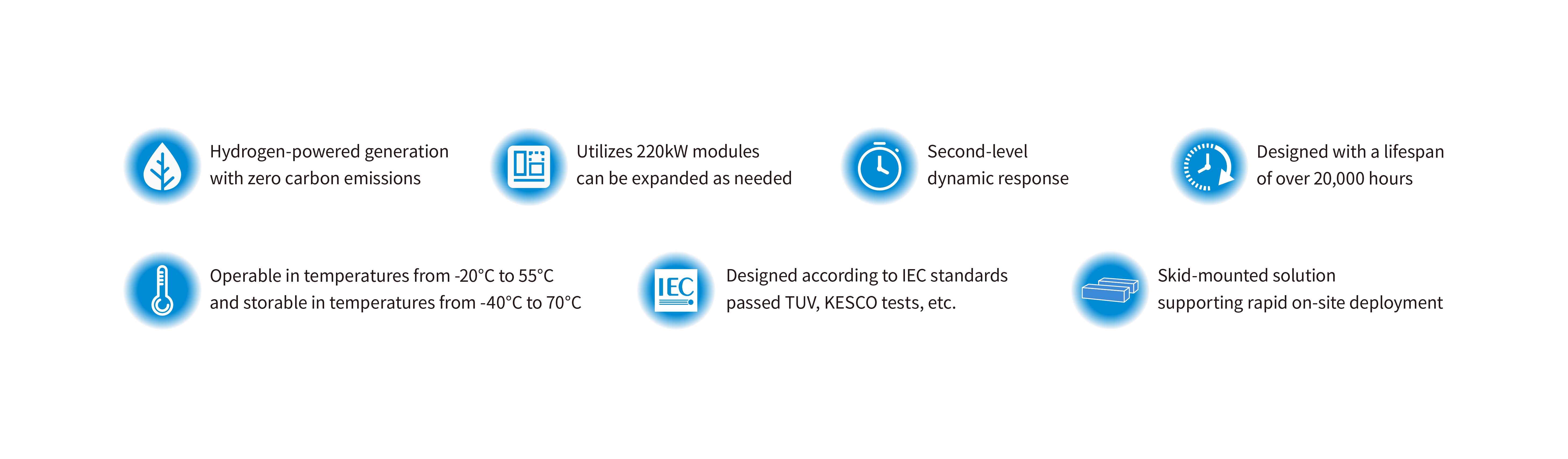 Troowin 2.5MW fuel cell power plant, , developed based on the self-researched G4 platform, is specifically designed for peak-shaving power generation scenarios. It is equipped with 12pcs of 220kW fuel cell modules and can be used in parallel according to customer requirements. The system has passed over 46 tests, including performance, safety, IP protection and EMC. The system is suitable for scenarios such as wind-solar-hydrogen coupling, peak-shaving power generation, charging station power supply, etc.