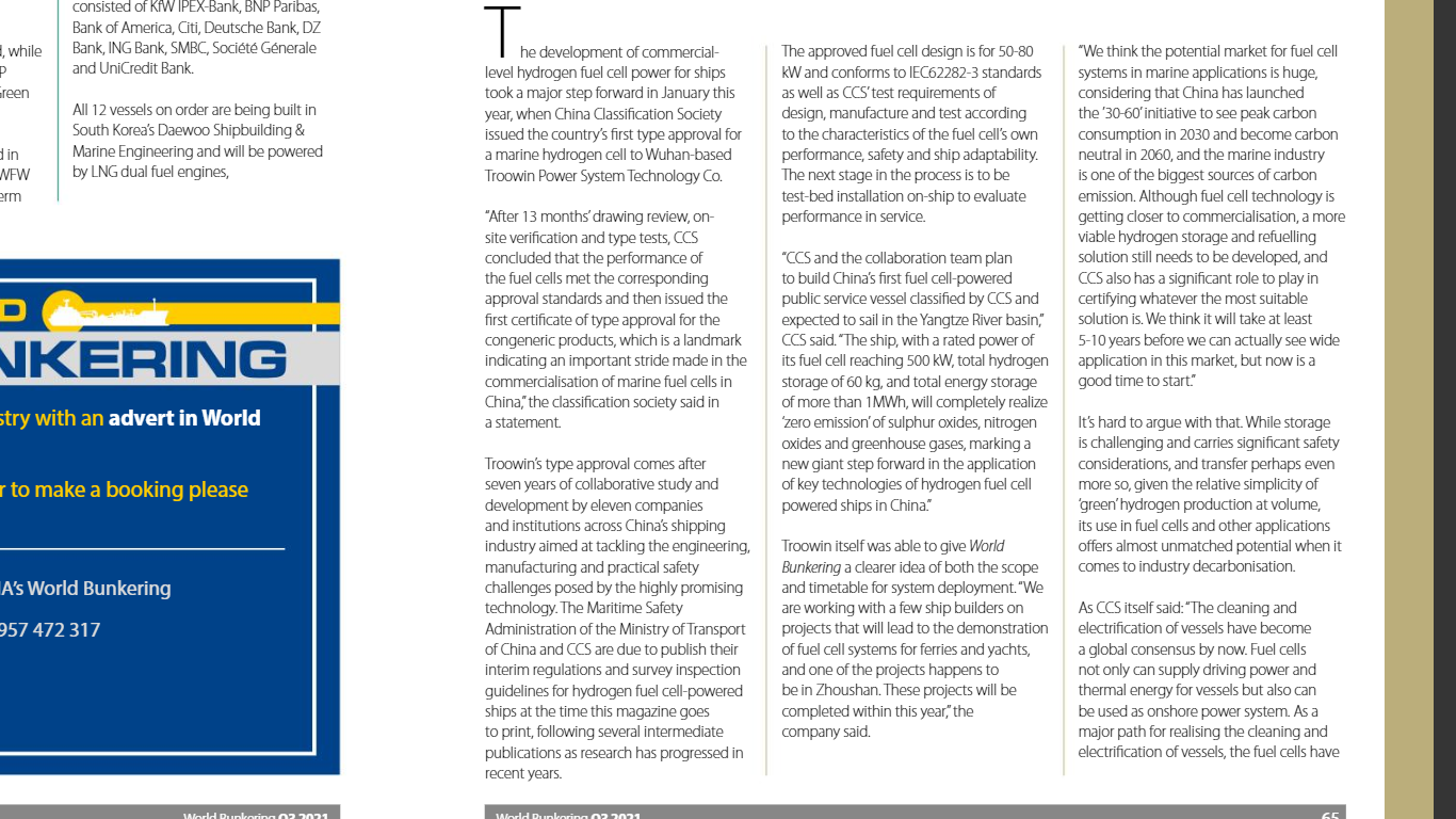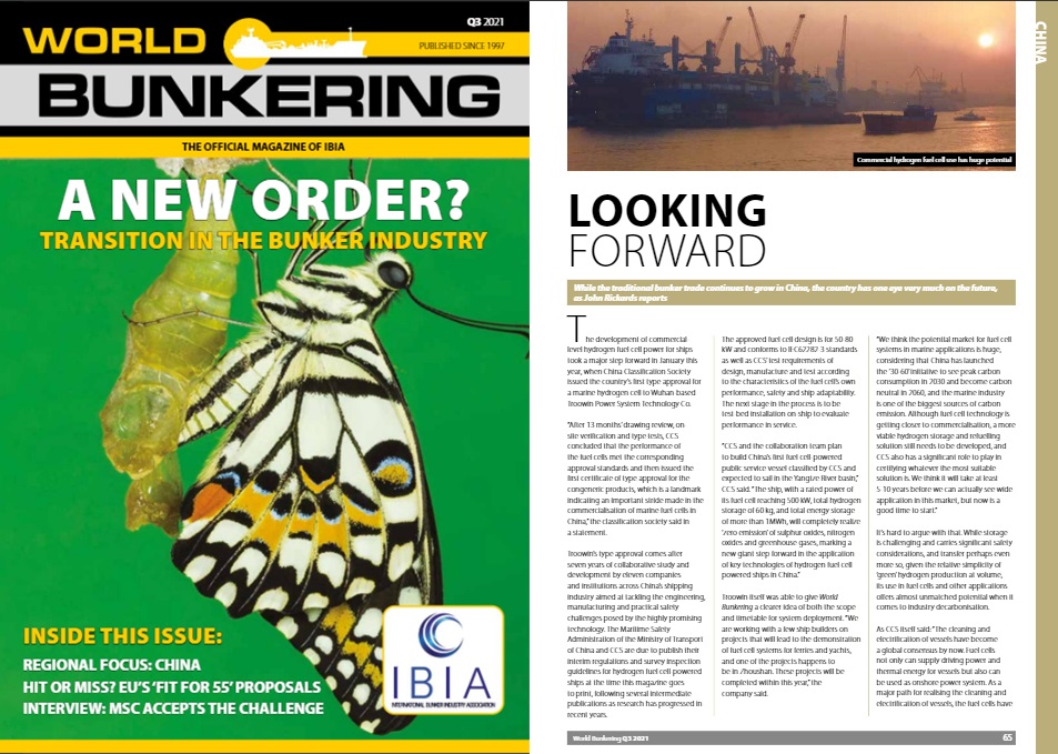 2022-01-20近期,武漢眾宇動(dòng)力系統(tǒng)科技有限公司(下稱眾宇)接受國(guó)際燃料工業(yè)行業(yè)協(xié)會(huì) (The International Bunker Industry Association ,IBIA)協(xié)會(huì)官方雜志《WORLD BUNKERING》訪談,就氫燃料電池在船舶領(lǐng)域的應(yīng)用與前景進(jìn)行了交流。