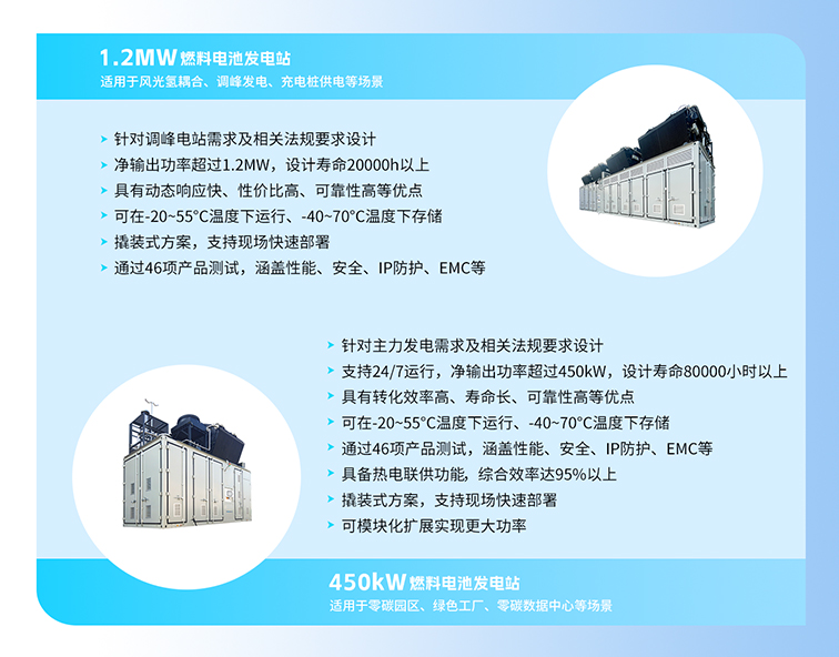 此次交付的1.65MW燃料電池發(fā)電站包含1.2MW和450kW兩套系統(tǒng),是基于眾宇自主研發(fā)的G4電堆平臺,針對不同應(yīng)用場景分別開發(fā)的兩個產(chǎn)品,可為用戶提供高效、可靠、穩(wěn)定和環(huán)保的電力保障。