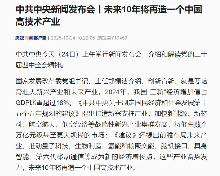 2025-10-25國家發(fā)展改革委黨組書記、主任鄭柵潔介紹,創(chuàng)新育新,就是要培育壯大新興產(chǎn)業(yè)和未來產(chǎn)業(yè)。2024年,我國“三新”經(jīng)濟增加值占GDP比重超過18%?!吨泄仓醒腙P(guān)于制定國民經(jīng)濟和社會發(fā)展第十五個五年規(guī)劃的建議》提出打造新興支柱產(chǎn)業(yè),加快新能源、新材料、航空航天、低空經(jīng)濟等戰(zhàn)略性新興產(chǎn)業(yè)集群發(fā)展,將催生數(shù)個萬億元級甚至更大規(guī)模的市場;《建議》還提出前瞻布局未來產(chǎn)業(yè),推動量子科技、生物制造、氫能和核聚變能、腦機接口、具身智能、第六代移動通信等成為新的經(jīng)濟增長點,這些產(chǎn)業(yè)蓄勢發(fā)力,未來10年將再造一個中國高技術(shù)產(chǎn)業(yè)。