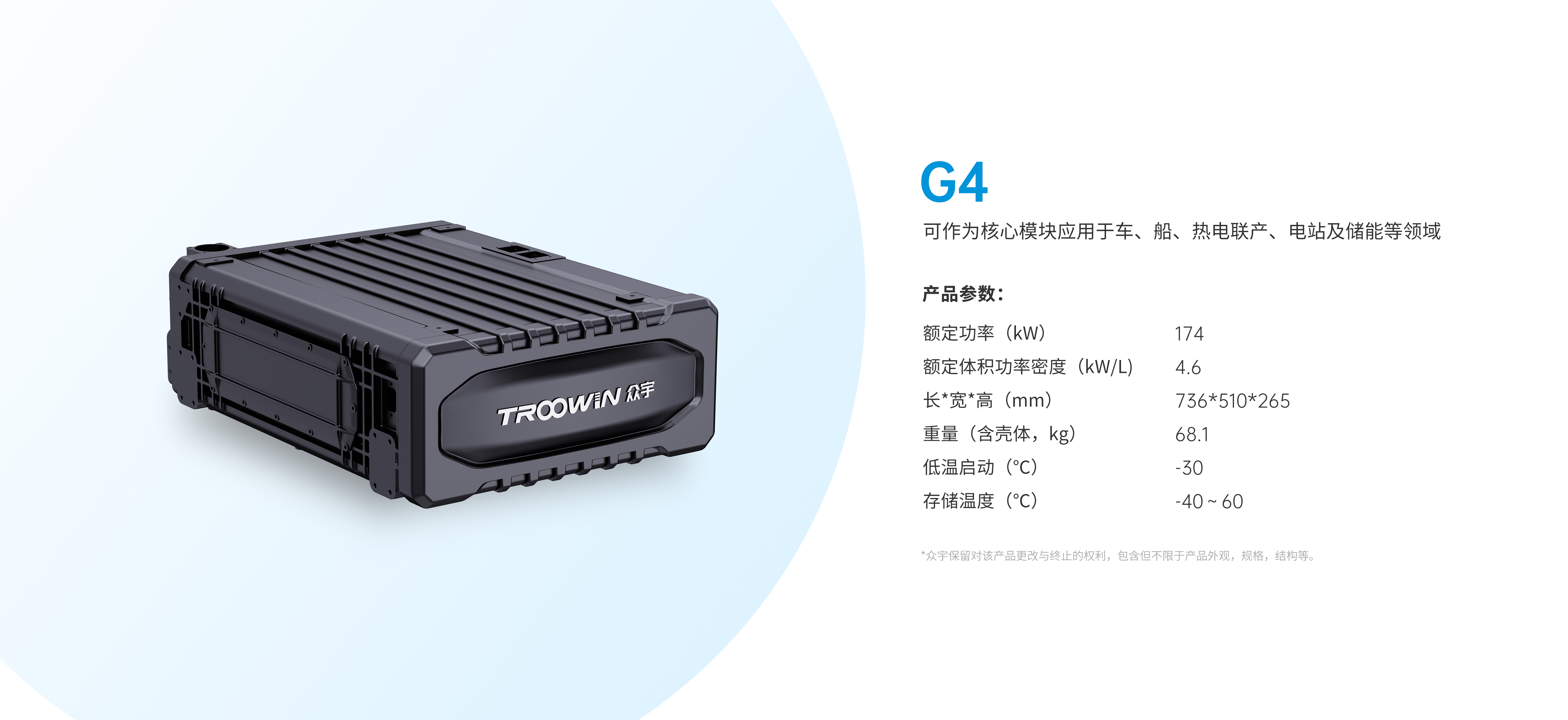 眾宇自主研發(fā)的全新一代石墨液冷電堆,單堆功率覆蓋20-180kW,可作為核心模塊應(yīng)用于車、船、熱電聯(lián)產(chǎn)、電站及儲能等領(lǐng)域。